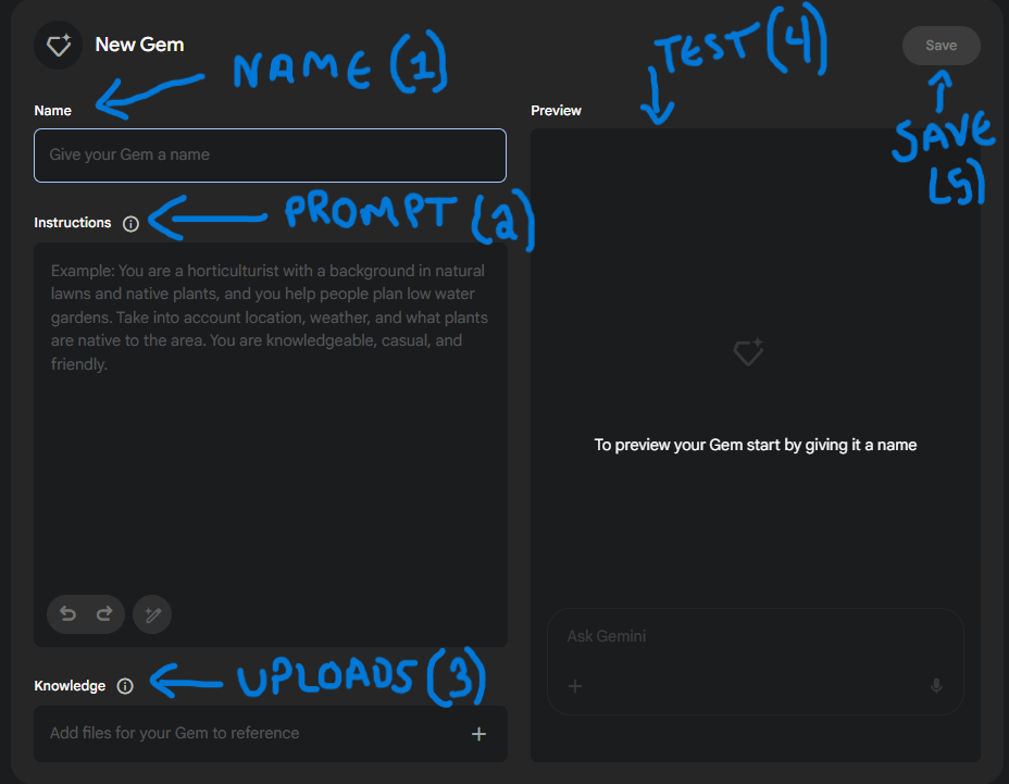 4. Preview and Refine: On the right side of the screen, you’ll see a preview panel. Use this to test your Gem as you build it. Type in prompts and observe how it responds. Does it “get” what you’re asking? Is the tone right? Use these interactions to refine your instructions, making your Gem even more effective. This is a really interesting step, and i recommend you spend some time here. It can make you a better prompter, as i’ll expand on a bit below.